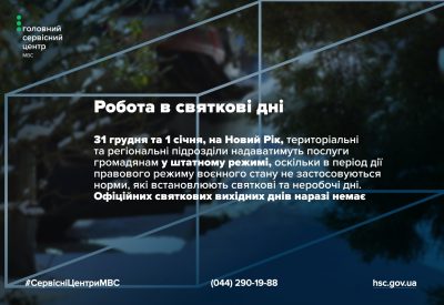 Сервісні центри МВС працюють на зимові свята за звичним – п’ятиденним графіком та без додаткових вихідних днів. Тобто, 31 грудня та 1 січня, на Новий Рік, територіальні та регіональні підрозділи, надаватимуть послуги громадянам у штатному режимі. Адже у період дії правового режиму воєнного стану не застосовуються норми, які встановлюють святкові та неробочі дні. Тобто, офіційних святкових вихідних днів наразі немає.
