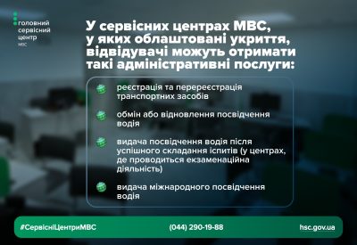 У сервісних центрах МВС, в яких облаштовані укриття, відвідувачі можуть отримати такі адміністративні послуги: