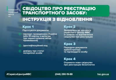 - Звернутись до зручного сервісного центру МВС із заявою на відновлення свідоцтва про реєстрацію.