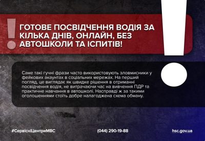 «Готове посвідчення водія за кілька днів, онлайн, без автошколи та іспитів». Саме такі гучні фрази часто використовують зловмисники у фейкових акаунтах в соціальних мережах. На перший погляд, це виглядає як швидке рішення в отриманні посвідчення водія, не витрачаючи час на вивчення ПДР та практичне навчання в автошколі. Насправді ж за такими оголошеннями стоїть добре налагоджена схема обману. Замість готових документів – люди втрачають гроші та персональні дані.