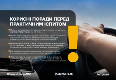 Нагадуємо, що тривалість практичного іспиту на вулично-дорожній мережі складає щонайменше 20 хвилин та не може перевищувати 60 хвилин. Допускаються 3 помилки, якщо більше – іспит не складено.
