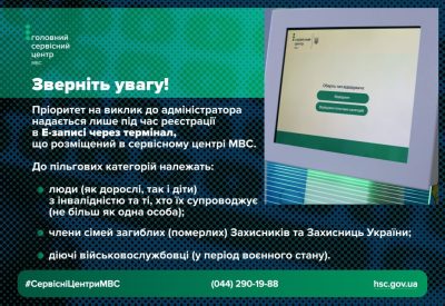 Звертаємо увагу, що пріоритет на виклик до адміністратора надається лише під час реєстрації в Е-записі через термінал, що розміщений в сервісному центрі МВС. До пільгових категорій належать: