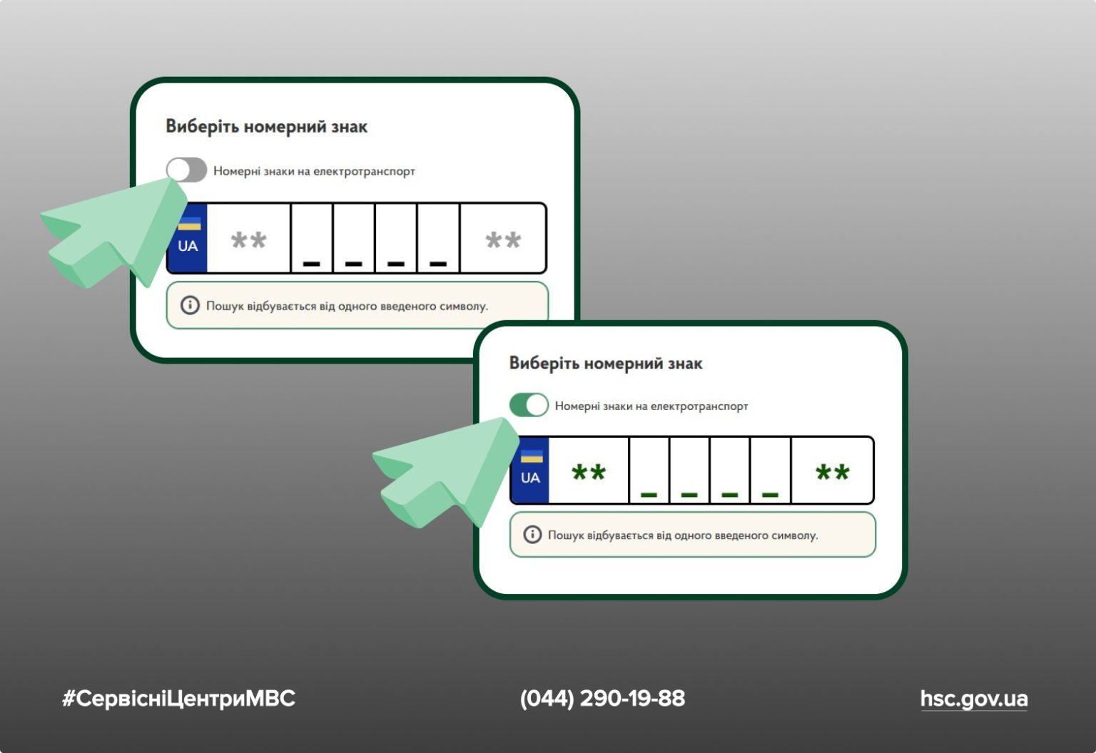 - За потреби звернути увагу на позначку для електротранспорту — якщо номерні знаки призначені для електромобіля, відповідна галочка має бути активною (зеленою).