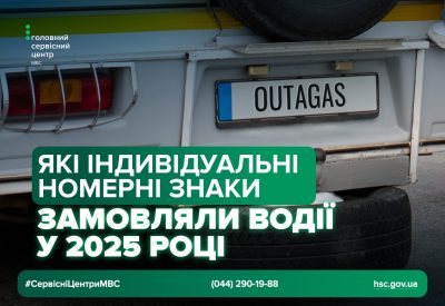 Для багатьох автовласників індивідуальні номерні знаки – це можливість підкреслити свій стиль, індивідуальність та самовираження. Попит на них помітно зростає: у 2025 році Головний сервісний центр МВС виготовив та видав 20 570 комплектів індивідуальних номерних знаків. А це на третину більше порівняно з 2024 роком. Часто на автошляхах можна помітити автівки з індивідуальними номерними знаками, які особливо привертають увагу яскравими та оригінальними написами, викликаючи посмішку, а іноді й здивування. Серед замовлених індивідуальних номерних знаків у 2025 році найбільше запам’ятались креативні написи, які відображають характер власника, професію та почуття гумору: ПОТУЖНИЙ ШАНОВНА ШЕРШЕНЬ АСПІРИН ЗЛЮКА АГРОНОМ МУРЧІК МАЛИШКА Серед індивідуальних номерних знаків були написи і з власними іменами власників: АРТЕМЧИК ДАРИНА ГОМЕР МІТЯЙ МИХАСИК НАТАЛІ Замовити індивідуальні номерні знаки можна онлайн у Кабінеті водія, або звернувшись до будь-якого зручного сервісного центру МВС. Отримати готовий комплект номерів  можна отримати доставкою на відділення «Нової Пошти» або самостійно у Головному сервісному центрі МВС у Києві — в управлінні стандартизації за адресою вул. Мрії, 19. Після отримання індивідуальних номерних знаків власнику необхідно звернутись до будь-якого сервісного центру МВС та закріпити їх за своїм авто. Відомості про іменний номер адміністратор сервісного центру МВС вносить до Єдиного державного реєстру транспортних засобів та видає нове свідоцтво про реєстрацію транспортного засобу. Детальніша інформація про замовлення та виготовлення індивідуальних номерних знаків розміщена на сайті  ГСЦ МВС. Консультацію щодо послуг сервісних центрів МВС можна отримати за телефоном (044) 290-19-88 або на сторінках Головного сервісного центру МВС в Фейсбук та Інстаграм. Відповіді на найпоширеніші питання та корисну інформацію черпайте на сайті.